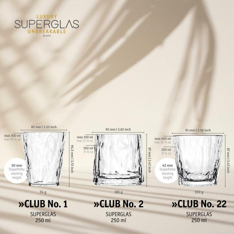 Detta glas tar väldigt lite plats eftersom den är smidigt stapelbar. Tack vare sin koniska form ligger glaset bekvämt i handen och det splittersäkra högteknologiska materialet ger glaset en behaglig känsla. Club No. 22 är särskilt lämplig för kalla drycker, då materialet isolerar fyra gånger bättre än vanligt glas och drycker håller sig svala längre.